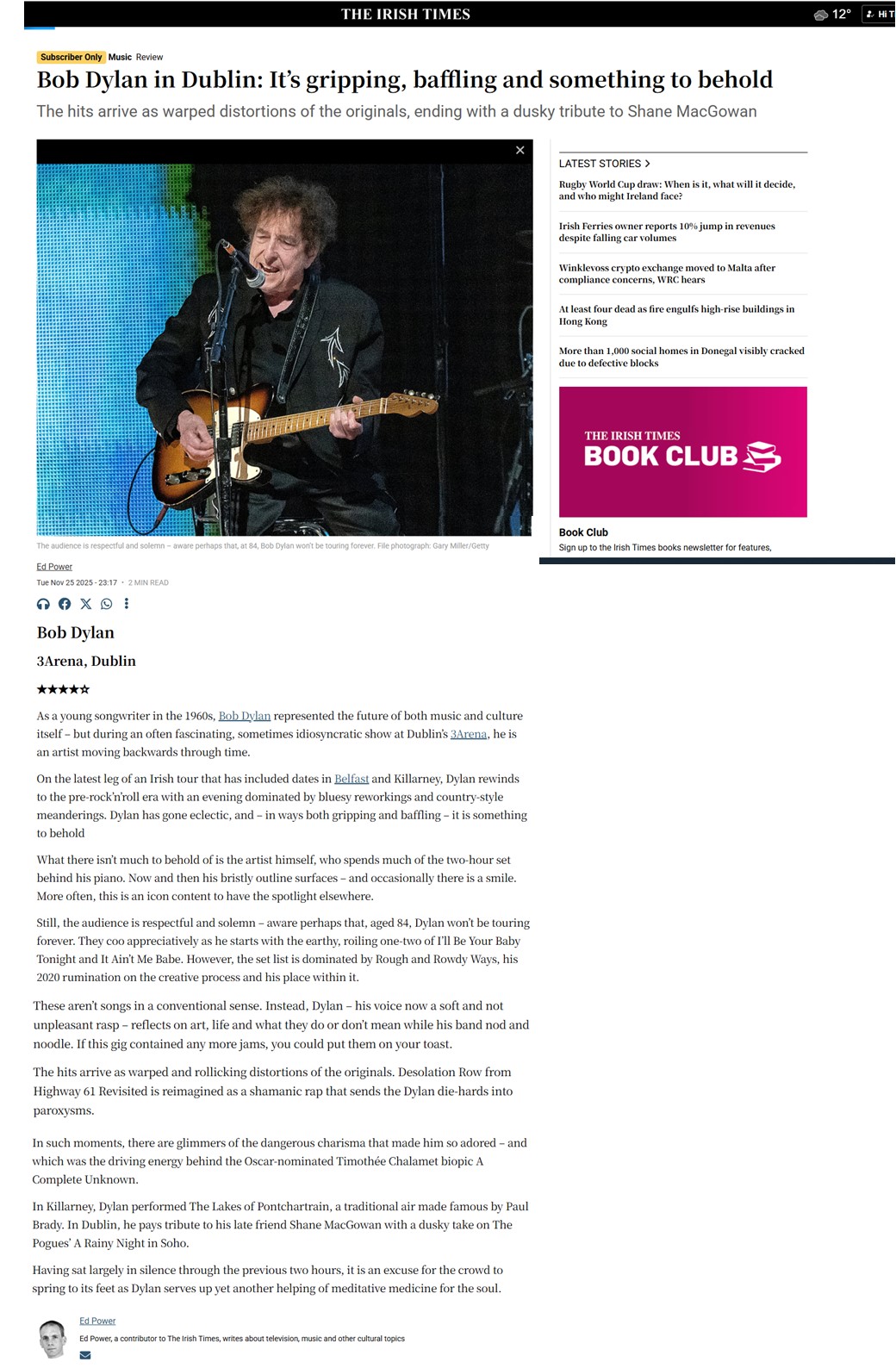 Bob Dylan in Dublin: It’s gripping, baffling and something to behold Paywall, - .jpg (The Irish Times) from Jacob Daniel, Scott Miller, Cliff Warnken, andrew nieurzyla, Tiernan Henry