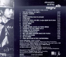 Date: Tue, 18 Jan 2000 03:39:54 -0500 From: "Daroczi, Doru"Subject: dylan covers album in Romania To: "'karlerik@monet.no'" Karl, A Dylan covers album was released in 1999 in Romania. Sung by Alexandru Andries the songs are translated (adapted) in Romanian. Very good album. The album name is 'negru - alb' (Black - White) There are 17 songs as follows: 1. Tot ce vreau, de fapt... (All I really want to do) 2. Corina, Corina (Corrina, Corrina) 3. La noi (Oxford Town) 4. Femei pentru zilele ploioase (Rainy Day woman 12&35) 5. Clipa Mea (Simple twist of fate) 6. E-atit de greu sa rizi, e-asa usor sa plingi (It takes a lot to laugh, it takes a train to cry) 7. Cunosc o fata (New pony) 8. Poate miine (One too many mornings) 9. Te vreau (I want you) 10. E bine, mama, doar ca pierd singe (It's alright ma', I'm only bleeding) 11. Vorbesc de cel orbit de zi (I pitty the poor imigrant) 12. E bine, nu te razgindi (Don't think twice, it's alright) 13. Stapinii razboiului (Masters of war) 14. Ma lasi prea singur daca vei pleca (You're gonna make me lonesome when you go) 15. Jos, in viltoare (Down in the flood)] 16. Nu te cred (I don't believe you) 17. Cind am sa-mi pictez capodopera (When I paint my masterpiece) 1999, Alexandru Andries/Black Crow Productions For the moment this CD cannot be ordered on-line (as far as I know) but anybody who is interested can send me an email and I will buy it and mail it. I don't take money for this, I just ask for some Dylan stuff in return. Daroczi, Doru
