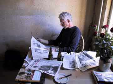 Waiting for Bob (Click for 368 K image) Got up early next morning, flew in to Kastrup, Copenhagen and sat me on a train to Horsens. At the station I was met by Flemming's two sons holding up a sign with my name. They drove me to the farm Højballegaard, where there was a preconcert party for the people who had been on the ticket line. I met many people whose names I had only seen on my screen before, and some whose work I had also seen in print. Even some Norwegians: Johnny Borgan, Håvard Rem, Kim Larsen, and it was very nice to see them.