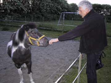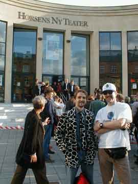 Me and Johnny Borgan - Håvard Rem and me. I met the hosts, Pia and Jørn, and Ian the man who had the special "I was number x in line at Horsens T-shirts made. Flemming who had my ticket, was Number Nine, so I got me some with that number. - Bound to become an item, don't you agree? Nice many hundred year old farm, special attraction was a huge tree named Yggdrasil that had been carved into a sculpture of great power. See pictures at their web page. The Horsens concert was a sponsored event, although the fans were definitely winners throughout. All the same, the Dylan gourmet lunch at the hotel was a bit over the top. But the food was good,and the company too. I'm glad they did not do the menu as a Minnesota hometown special, that would have to include some Scandinavian-American food, I imagine. We took a walk through the town over to the Teater about an hour before the show was to start. In the square, excitement was in the air, there were national TV teams, the local people were looking on, and several Danish showbiz personalities were in evidence, I was told. To me, we all looked the same, humans exited because we were going to hear Bob Dylan up close and personal. A bit more about my host, Flemming. Although I am sitting at his computer in his little two-hundred-year-old under reconstruction house enjoying his hospitality while he is at work, it is without undue pressure I can say that he is the top! A hard core Dylan fan, very hospitable, and he is running a 70-child kindergarten in half of his daytime job. They have horses, pigs, and chickens. In fact, Flemming became a media celebrity himself when he participated in a call-in Dylan phone quiz on national Danish Radio and won, just a day before the concert. The prize: Two tickets for the Royal Box in the Horsens Ny Teater at the Dylan concert, plus a free hotel room, almost like a Royal suite, with a huge bathroom. So his two sons got to sit in the Royal Box up in the balcony, and his girlfriend Tine had a seat around all the celebrities. After the concert Flemming was among those interviewed on TV. No "Judas!" there!
