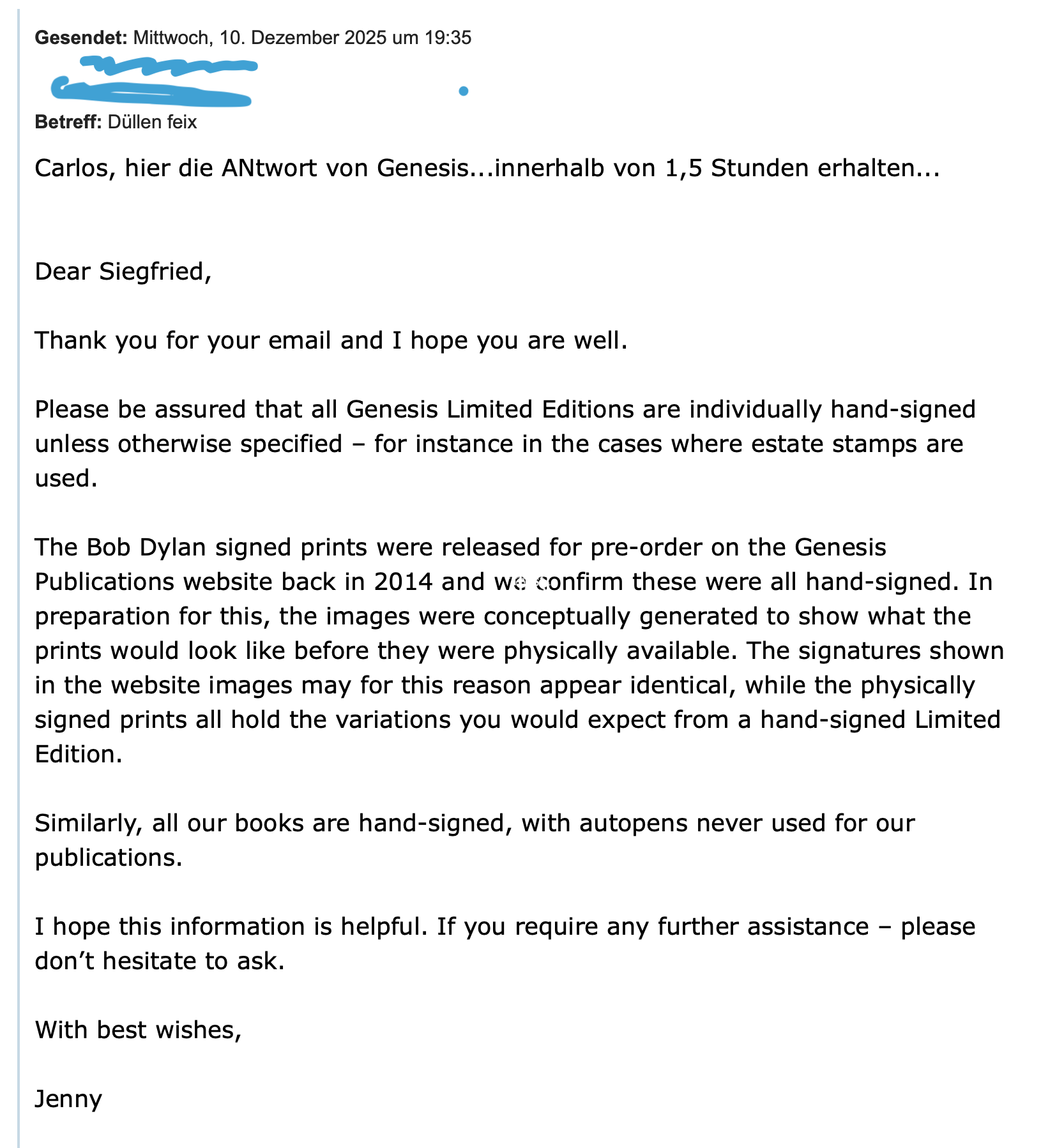 Genesis replies to question about Bob Dylan signed prints (.png) from Fred Tosi